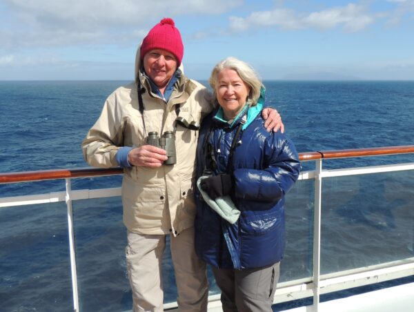 Off (just visible) Marion Island! BirdLife Lowveld Founder Members Duncan and Brigid Ballantyne on the MSC Musica during the Flock to Marion AGAIN! 2025 voyage