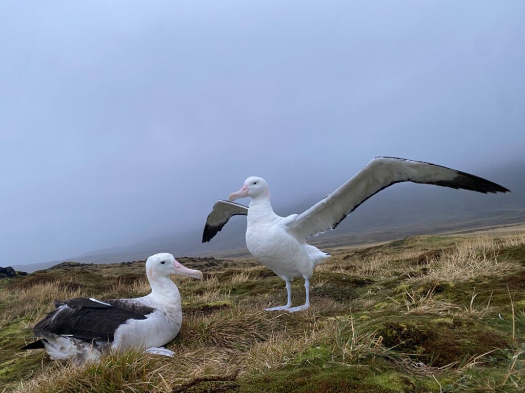 A Wandering Albatross pair (female sitting, male wing-spreading) near Swartkop Point on Marion Island’s west coast, photograph by Anton Wolfaardt