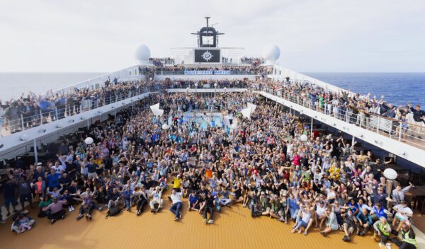 Heading home: all the birders, including Mark Perry, aboard the MSC Musica during the Flock to Marion AGAIN! 2025 voyage, photograph by Cassie Carstens