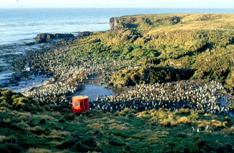 “Tony’s Folly” above the King Penguin colony at Archway Bay. At some stage it was painted orange from its original unpainted state and placed on the cliff top (as shown here) to use as a penguin observation hide and refuge in 1988/89, photograph by Bruce Dyer
