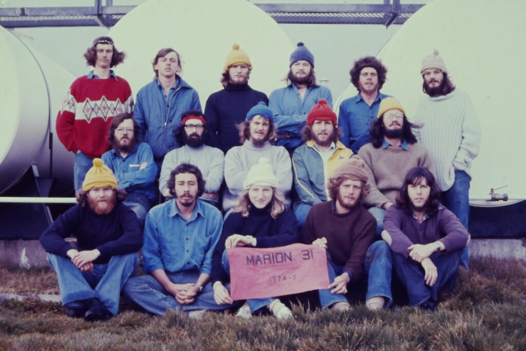 The Marion Island 31st Overwintering Team, 1974/75. Tony Williams is seated second from the left in the middle row, photograph by Raymond Thorpe