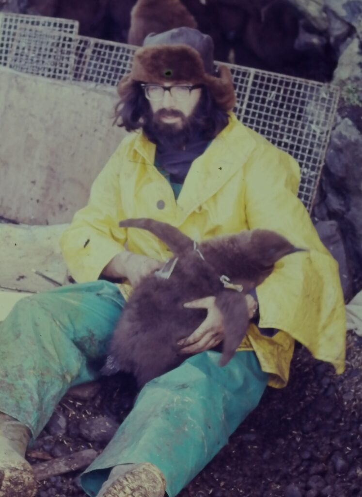 Tony Williams holds an African Penguin chick on a southern African guano island while working for Cape Nature, photograph from Waitara Williams