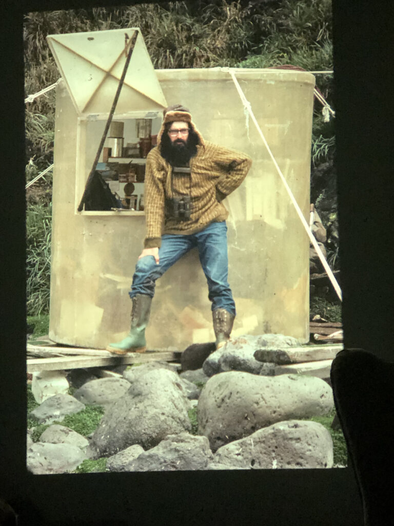 Tony Williams poses outside his converted water tank next to the King Penguin colony at Marion Island’s Archway Bay during the 1976/77 summer. The tank was deliberately left unpainted to allow light penetration, photograph from Socotra Williams