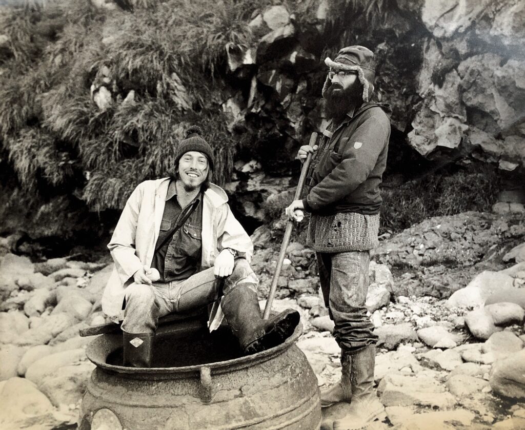 Tony Williams (right) and fellow 1976/77 team member Hans Lindeboom ham it up at the sealer’s trypot on Bullard Beach, Marion Island, photograph from Waitara Williams