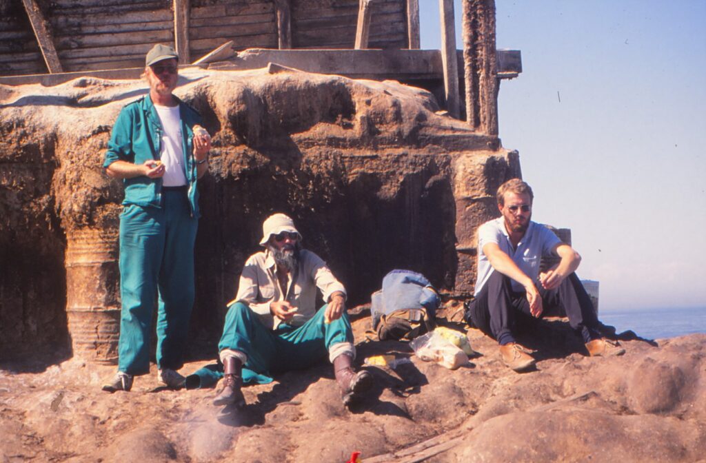 Tony (centre) takes a break on Hollamsbird Island on 9 May 1988, photograph by Bruce Dyer