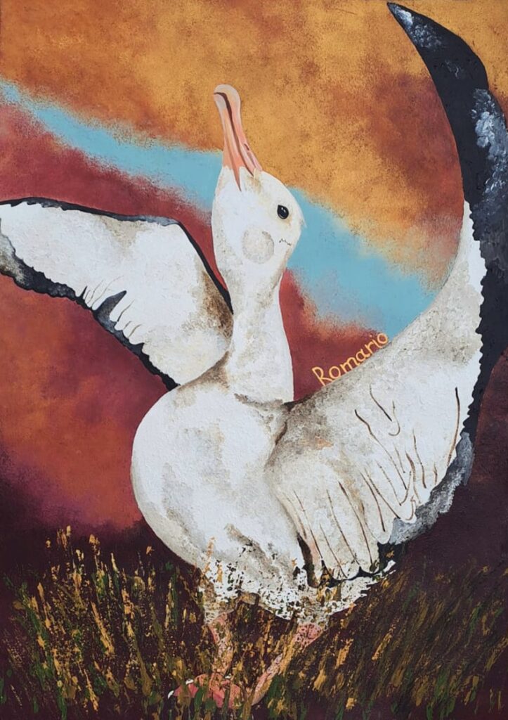A Wandering Albatross spreads its wings in display, artwork by Romario Valentine