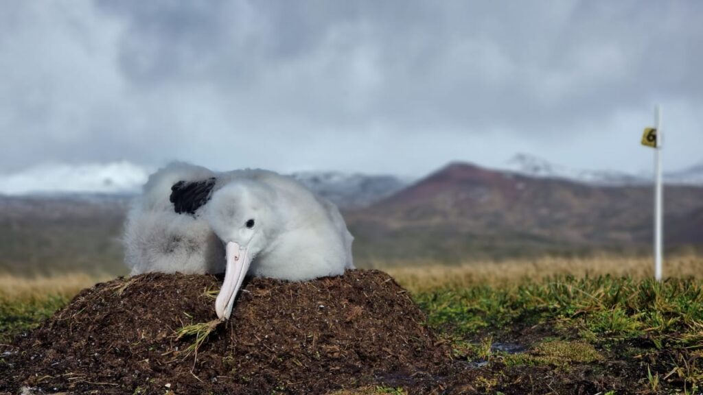At risk to attacks by mice. A Wandering Albatross chick in Marion Island study colony repairs its nest, photograph by Michelle Risi