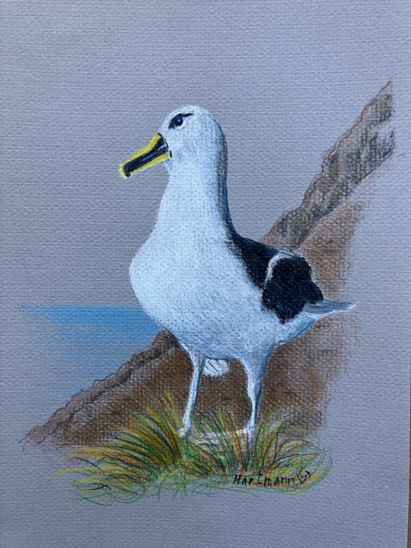 Grey-headed Albatross on Marion Island, Prismacolor pencil by Joyce Hartmann, of Artists and Biologists Unite for Nature (ABUN) for the MFM Project, after a photograph by Kim Stevens
