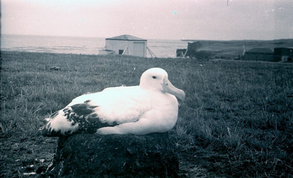 A Wandering Albatross on its mud nest close to the weather station on Marion Island soon after annexation in early 1948. Photograph by M1 Team Leader, Martin Crawford, courtesy of his son, Martin Crawford and the Antarctic Legacy of South Africa